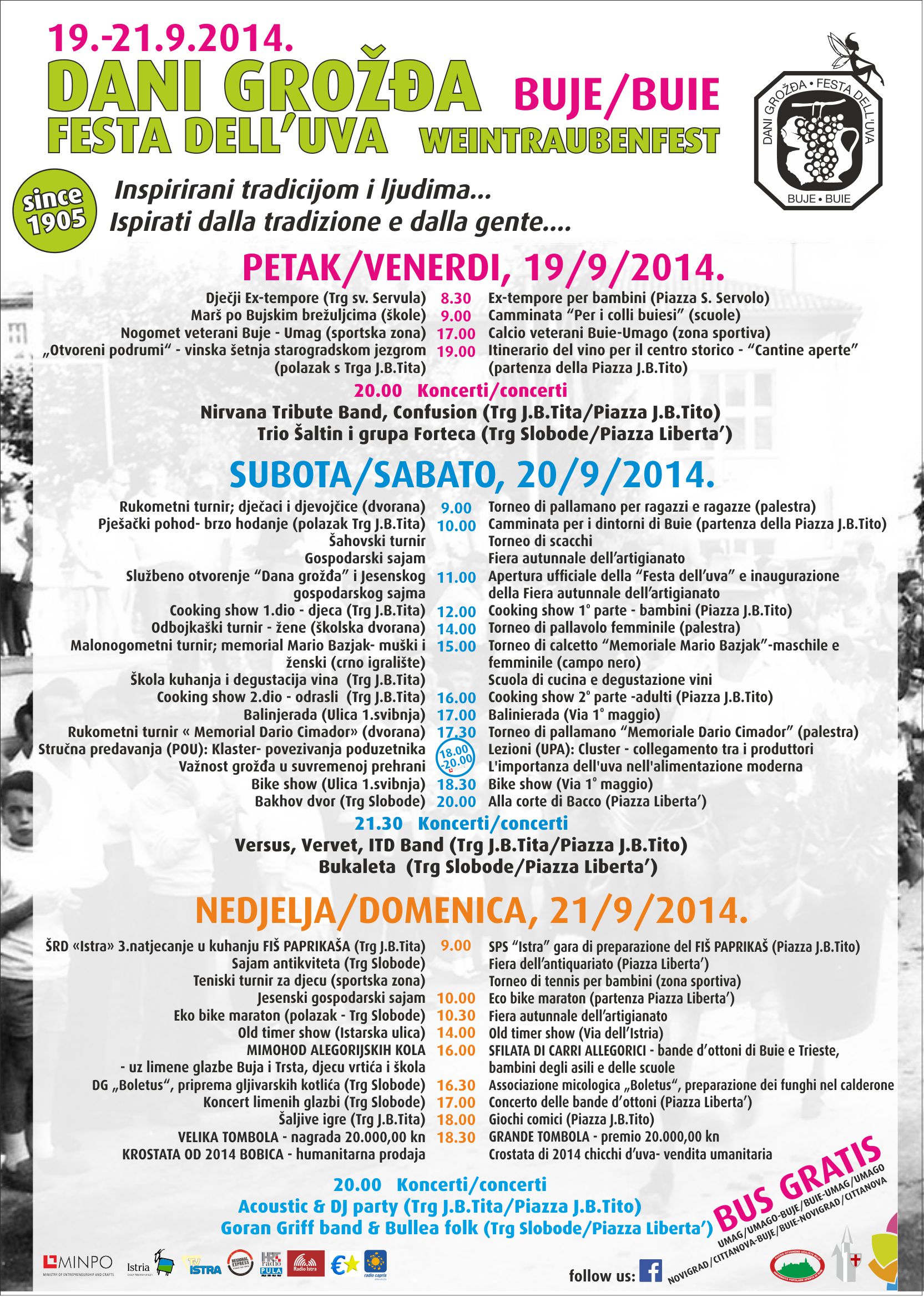 Ovim putem proslijeđujemo Vam dobivenu informaciju o održavanju „Jesenskog gospodarskog sajma“, koji će se ove godine po prvi puta organizirati u sklopu tradicionalne 109. proslave Dana grožđa u Bujama, od 19.-21.9.2014. godine.