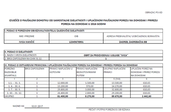 Obrtnici obveznici paušalnog oporezivanja dohotka krajem svake godine, a najkasnije do 15. siječnja 2019. dužni su predati godišnje izvješće o ostvarenom dohotku u prethodnoj (2018.) godini na Obrascu PO-SD.